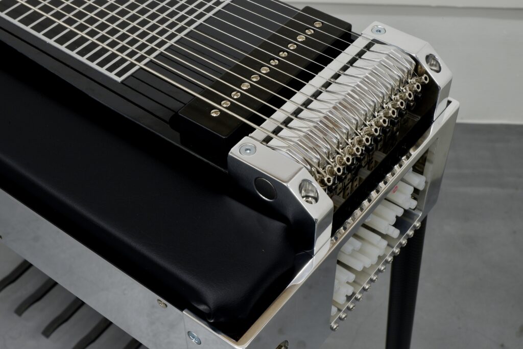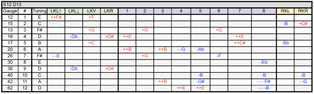 This guitar is set up as an S12 (8 pedals, 6 knee levers) with D13 tuning.